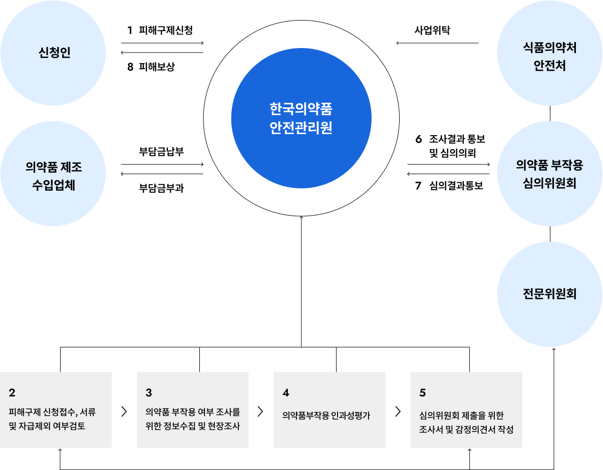 의약품 부작용으로 사망, 장애. 질병 피해를 입은 유족 및 환자에게 사망일시보상금, 장애일시보상금, 진료비 및 장례비를 지급하는 사업입니다.